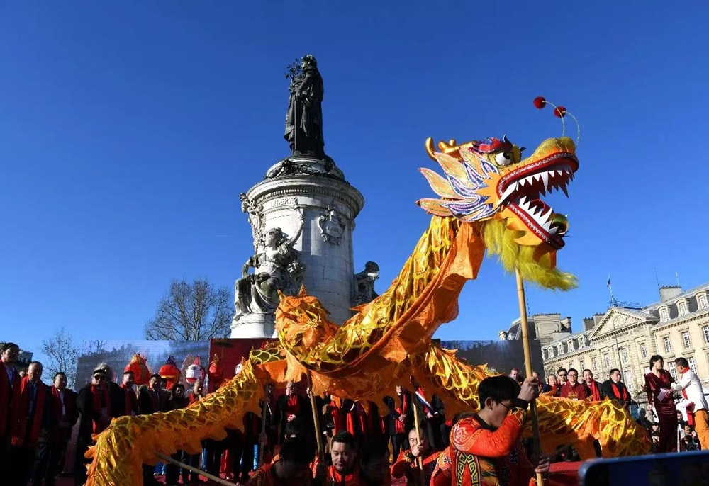 当地时间2025年2月1日,旅法华侨华人乙巳蛇年春节庙会在巴黎举行。图为当天的舞龙表演。中新社记者 李洋 摄