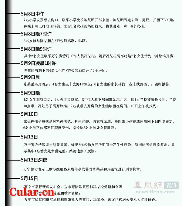 昨日上午11时40分,万宁市向媒体通报了该案最新进展。万宁市人民检察院副检察长曾圣和说,鉴于此案社会影响较大,该院召开了检委会,经检委会讨论,认为根据该案现有的事实和证据,陈某鹏、冯某松的行为已经触犯《中华人民共和国刑法》第二百三十七条之规定,涉嫌猥亵儿童罪。根据《中华人民共和国刑事诉讼法》第七十九条之规定,万宁市人民检察院于5月15日批准逮捕犯罪嫌疑人陈某鹏、冯某松。