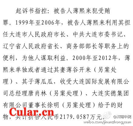 起诉书指控:薄熙来单独或通过其妻、其子受贿两千多万元