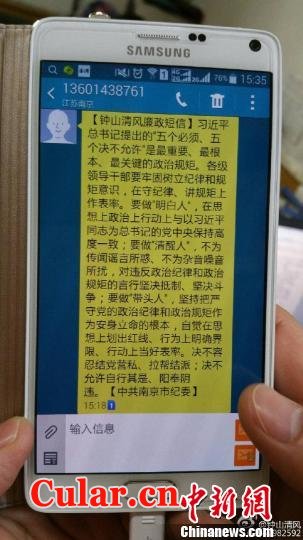 中新网南京2月14日电 (通讯员 吴德 记者 申冉)“习近平总书记提出的‘五个必须、五个决不允许’是最重要、最根本、最关键的政治规矩。各级领导干部要牢固树立纪律和规矩意识,在守纪律、讲规矩上作表率……”昨天,南京市市管以上领导干部的手机上均收到这样一条“廉政提醒短信”。该短信落款为“中共南京市纪委”。