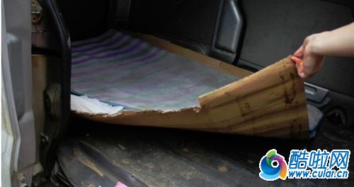 面包车后排座位被拆掉,车厢里铺上纸板和草席